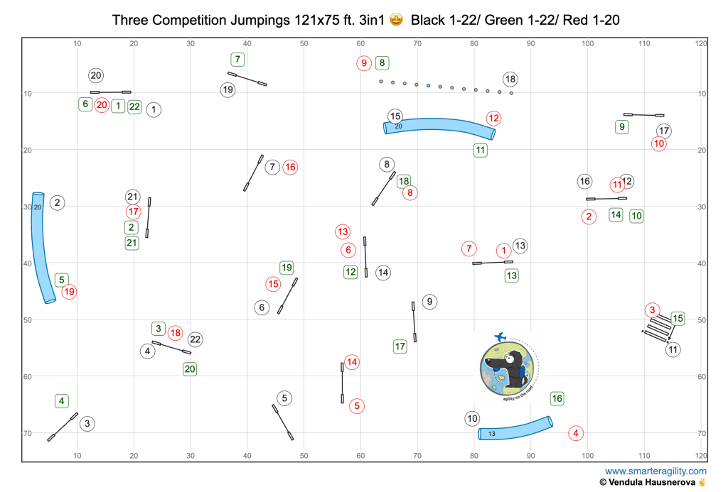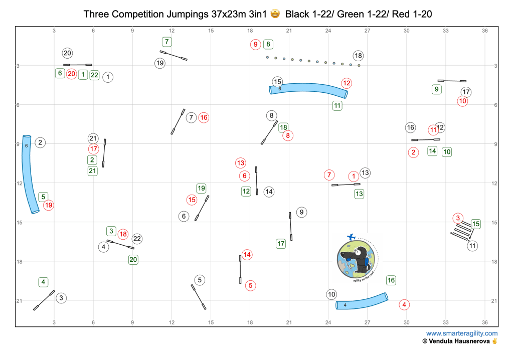 I understand that building full courses takes time, especially when training in your own garden where you’re the only one carrying all those tunnel bags! This often becomes a convenient excuse to stick with shorter sequences instead. That’s why you’ll find three competition courses (blue, purple and black numbers) designed within one setup in this training course—maximum training value with practical efficiency.